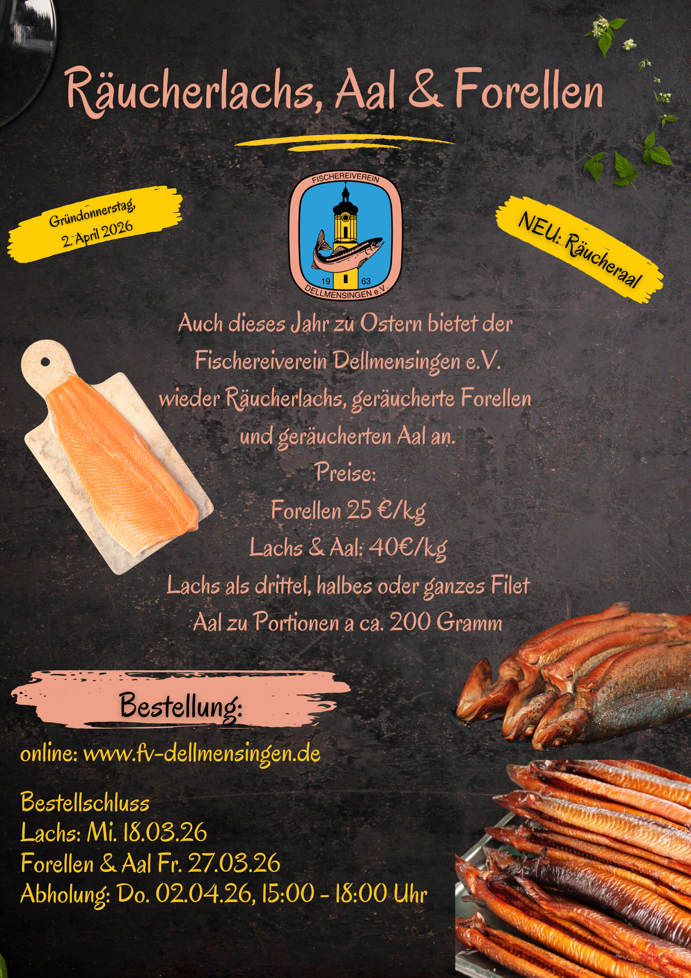 Auch dieses Jahr bietet der Fischereiverein Dellmensingen wieder Räucherlachs und geräucherte Forellen zu Weihnachten an Bestellschluss: Wir können leider keine weiteren Bestellungen mehr annehmen! Abholung: Dienstag, 23. Dezember 16:00 – … Weiterlesen